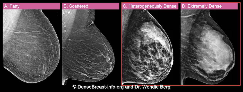 In general, patients whose breast density falls into categories C (heterogeneously dense) or D (extremely dense) are considered to have dense breast tissue. This includes about half of all women in the US who have mammograms to look for breast cancer.